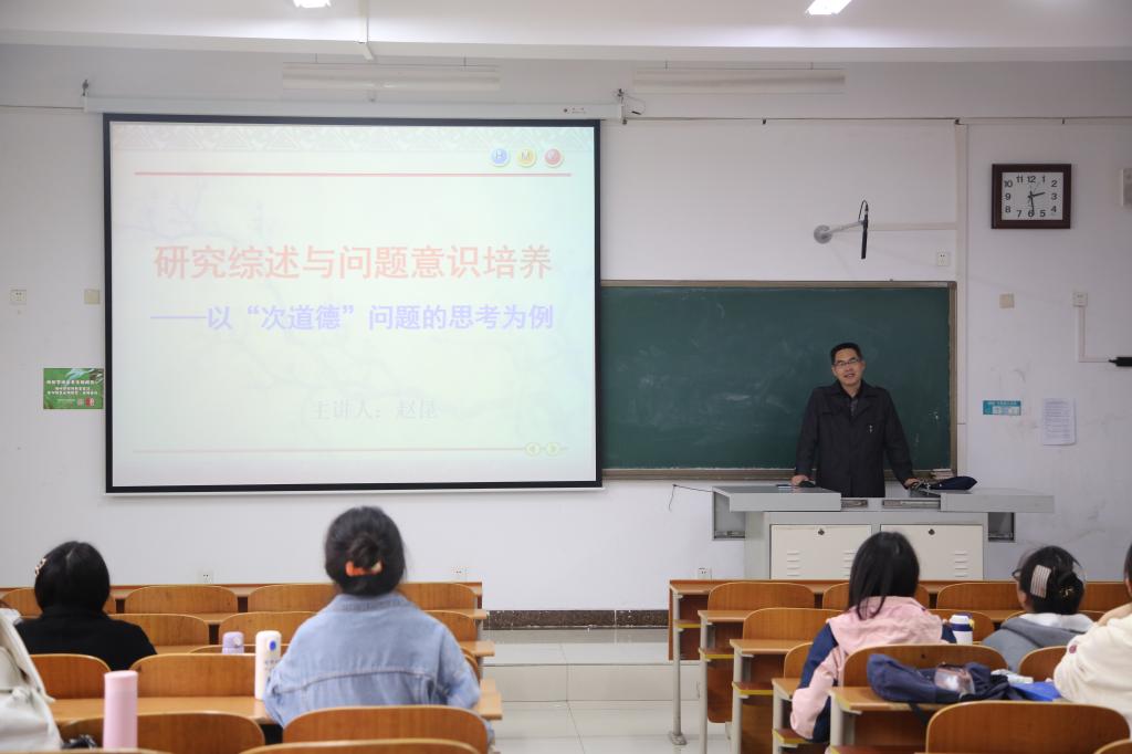 赵昆教授在讲座中指出,扎实的文献综述是一篇论文成功的一半,必须要对自己的研究进行定位,明晰研究的目的,培养问题意识。“问题”是科学研究的起点和归宿,而问题意识是对未知领域的探索和思考的起点,是对已知领域和矛盾体的深入发现和探究,是促进科学研究发展的重要前提。同时,必须具备对话意识,因为任何学术研究必须从熟悉、借鉴别人研究的成果开始,这是知识生产过程中的一个有机构成部分,在与其他人的对话中表述自己的思想。赵昆教授以“次道德”的问题为例,为同学们具体说明问题意识的重要性与怎么培养问题意识的做法。第一,学会略读,分清主次。第二,学会精读。第三,学会多疑问思考。问题并不能直接呈现在眼前,发现问题后,同学们还需要将现实的问题上升为理论的问题。