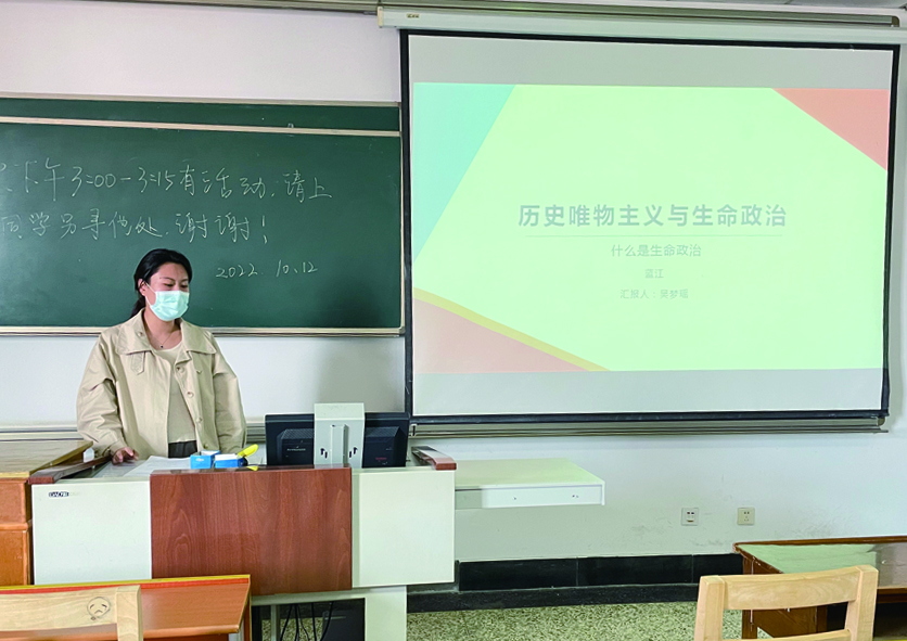 2021级吴梦瑶同学为大家分享了《历史唯物主义与生命政治》。她探讨了“生命政治”的概念以及与历史唯物主义的关系,厘清生命政治是政治权力直接作用于生物性生命的政治,之后引用福柯与德勒兹的观点,剖析解读所有人的生物性生命都被数据化后,独立的个体向总体数据库分体演进的趋势。