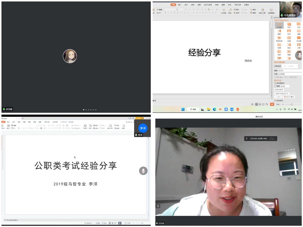 会上,2019级外国哲学专业毕业生徐泽鑫(升学于首都师范大学)为大家介绍了自己考博的心路历程,并分别就报考方向、报考院校、联系老师三个方面对考博过程进行了详细解读;2019级马克思主义哲学专业毕业生周铁岩(升学于上海师范大学)与同学们分享了自己考博的经历,并勉励师弟师妹要坚持学习,潜心钻研;2019级马克思主义哲学专业毕业生李洋(就职于山东省金乡县羊山镇机关)为大家介绍了自己对于公职类考试的心得体会,他从报考岗位、备考时间、考试内容等方面提出建议,鼓励师弟师妹们多去尝试、积极报考;2019级马克思主义哲学专业毕业生刘芸霞(就职于莱州市委政法委)分别从前期准备、就业方向、信息获取、心态调整等方面向同学们分享了自己事业编上岸的经验,并结合个人求职心路历程向同学们重点介绍了结构化面试的基本内容和考察重点。随后,分享会进入提问交流环节,同学们就自己在考博或者求职过程中遇到的问题积极发问,四位毕业生给予了耐心地解答,现场气氛活跃。