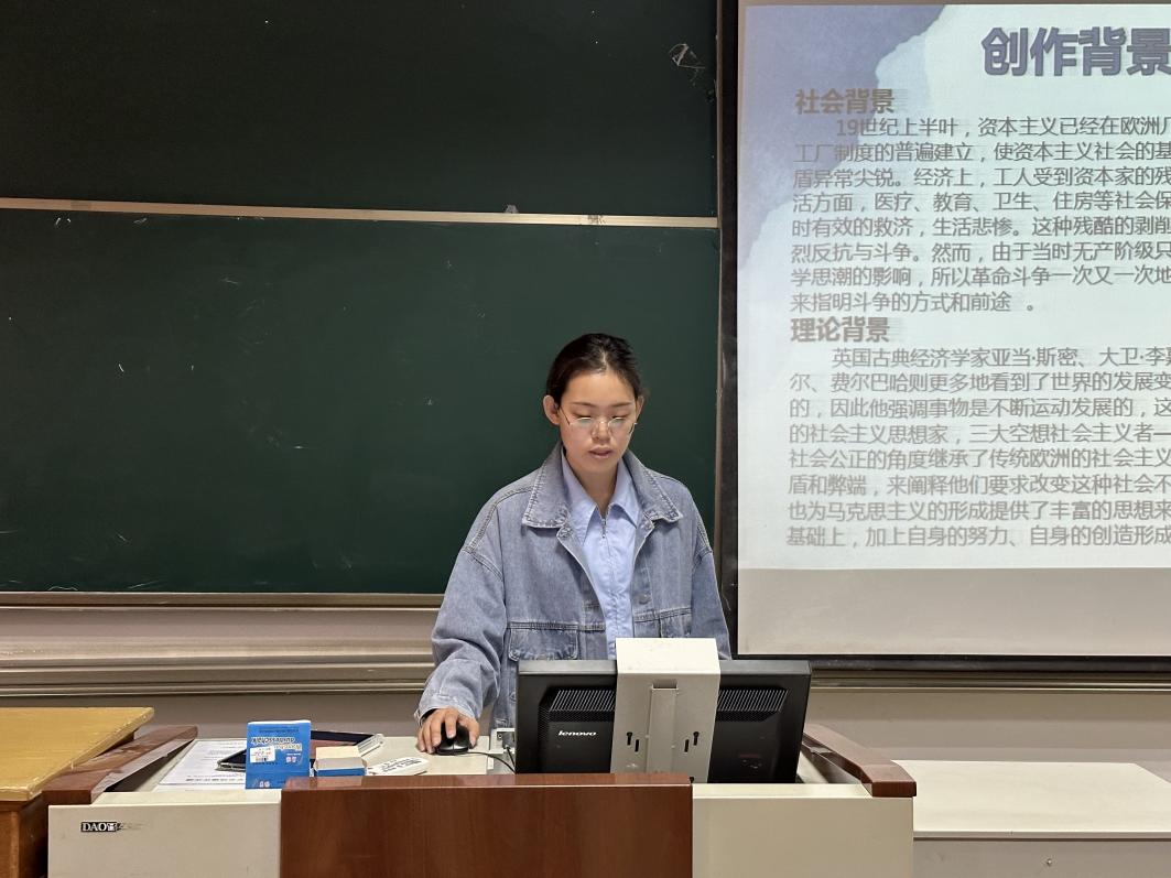 2023级宫晓云同学分享了关于《共产党宣言》的读书心得。宫晓云同学就本书的作者介绍、创作背景、创作过程、框架内容等多方面解读了本书内容,并提出了关于此书的两个问题并加以解释。