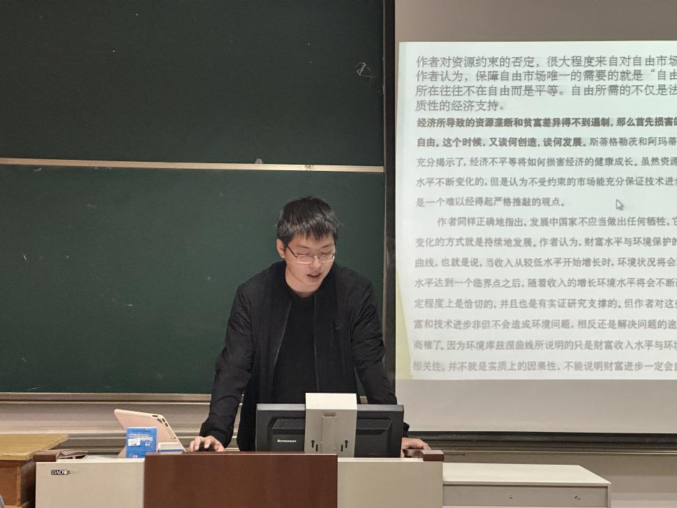 首先,2022级李雨泰同学就瓦茨拉夫·克劳斯《环保的暴力》的内容进行分享。李雨泰同学首先说明了他对本书整体框架的分析,并分析书中作者对于环境的判断,指出在本书的开篇作者就直抒胸臆的表示:当今世界环境的纠纷与生态环境无关,既不是一个自然科学问题,也不是社会科学问题,而首先是意识形态问题,是要自由还是要专治的问题。并根据自己的理解谈了谈环保主义(或环保组织)和政治权力之间的关系。