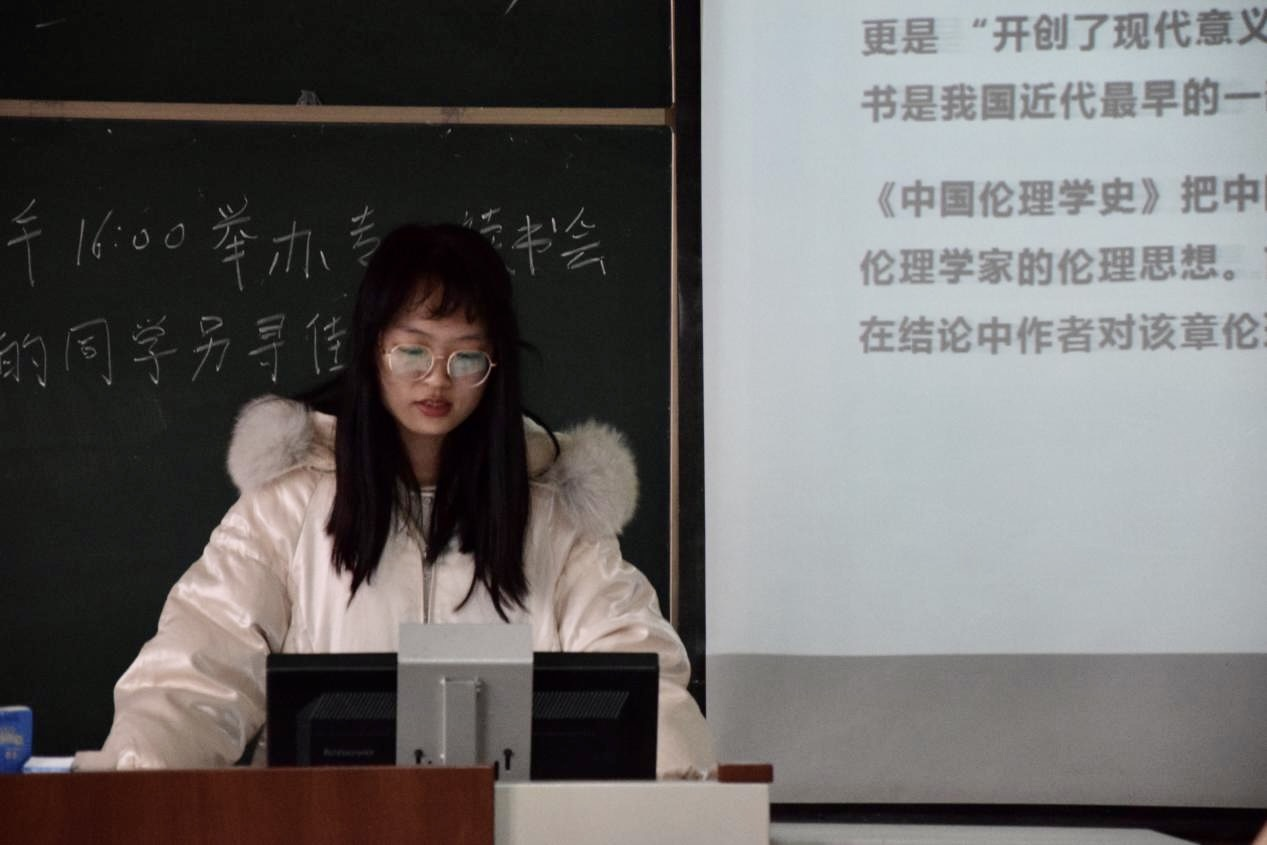 2023级李鑫宇同学分享了蔡元培的《中国伦理学史》一书。她将孔子的人性论主张作为切入点,说明孔子率先提出了“性相近也,习相远也”这一关于人的本质、基本属性的理论。此外,还对蔡元培先生的《中国伦理学史》进行了进一步的学习,加深了大家对伦理学的学习深度。