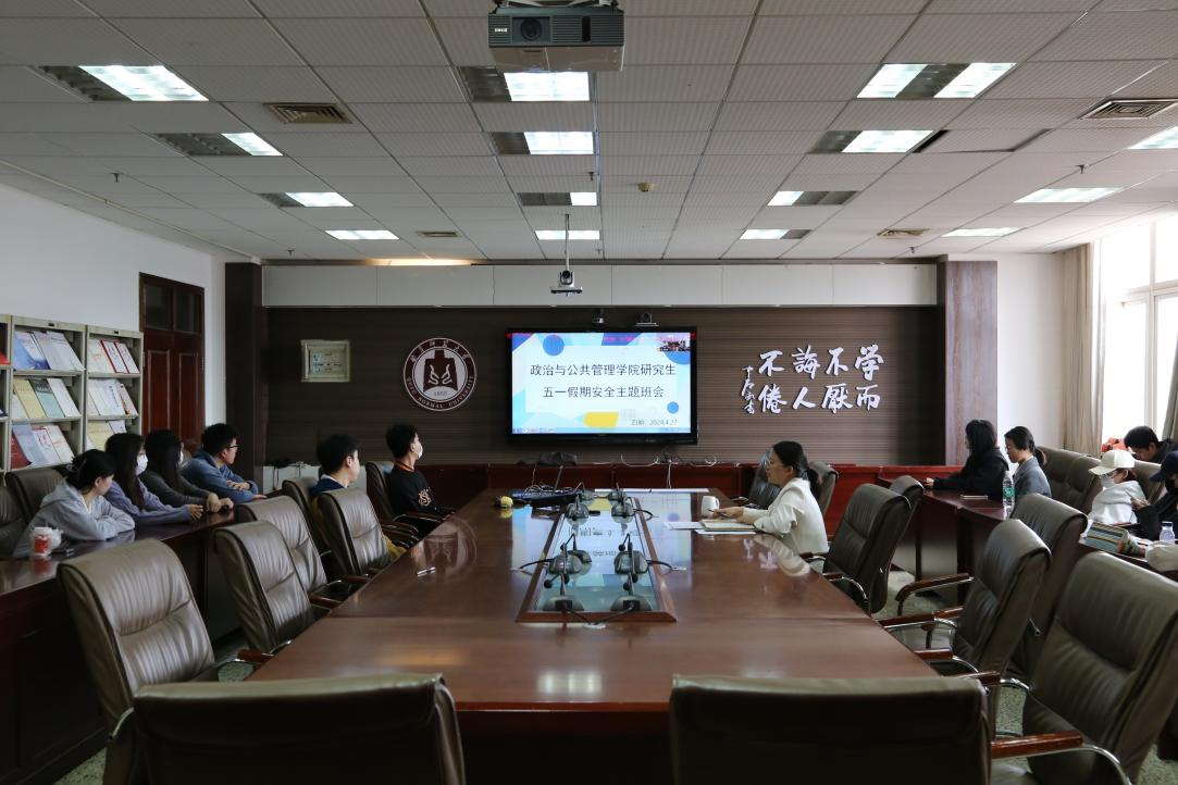 于JC909会议室以线上线下结合的方式召开五一假期安全主题班会,此次班会由研究生辅导员徐莉主持。