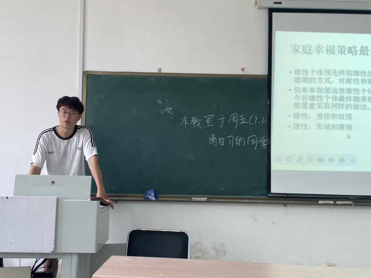骆毅恒同学对全书进行了的整体性概括分享和重点部分的凝练总结,他向大家提出问题——“动物的基因是否与人类相似,又以何种方式体现?”同时,他对社会学说中的主要论题逐一做了详细介绍,如利他和利己行为的概念、遗传学上的自私的定义、亲族学说(包括亲子关系和群居昆虫的进化)、性比率学说、相互利他主义、欺骗行为和性差别的自然选择等。