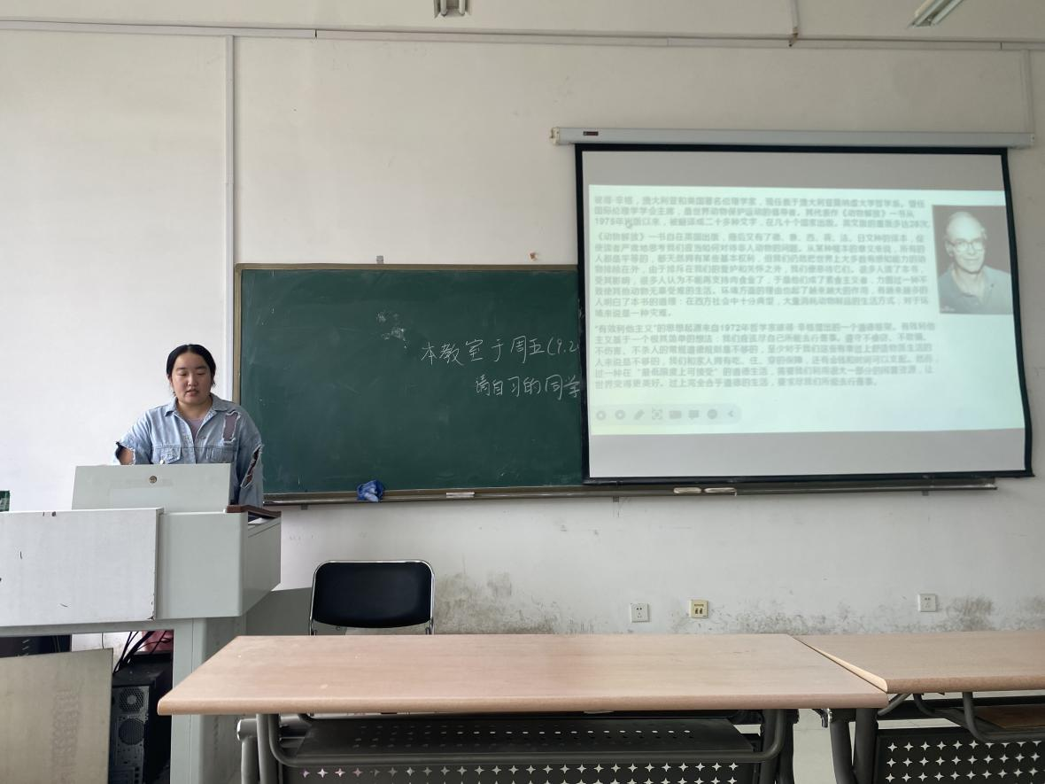 2023级魏岩楠同学分享了彼得·辛格的《动物解放》一书。她从道德与伦理的角度,讨论了人类在怎样制造动物的痛苦,以及按照伦理原则人应当怎样对待动物。《动物解放》揭露了当今人类为了自己的需要,残酷地剥夺动物,其中工业化养殖食用和动物实验,是造成大量动物痛苦的主要方式,并且从追溯西方人对待动物的态度的历史渊源。魏岩楠同学提出“你如何看待辛格的素食主义?”这一问题,引起了在场同学们的积极热烈讨论,大家各抒己见,思想交流碰撞,启发了同学们不同层面的思考与研究。