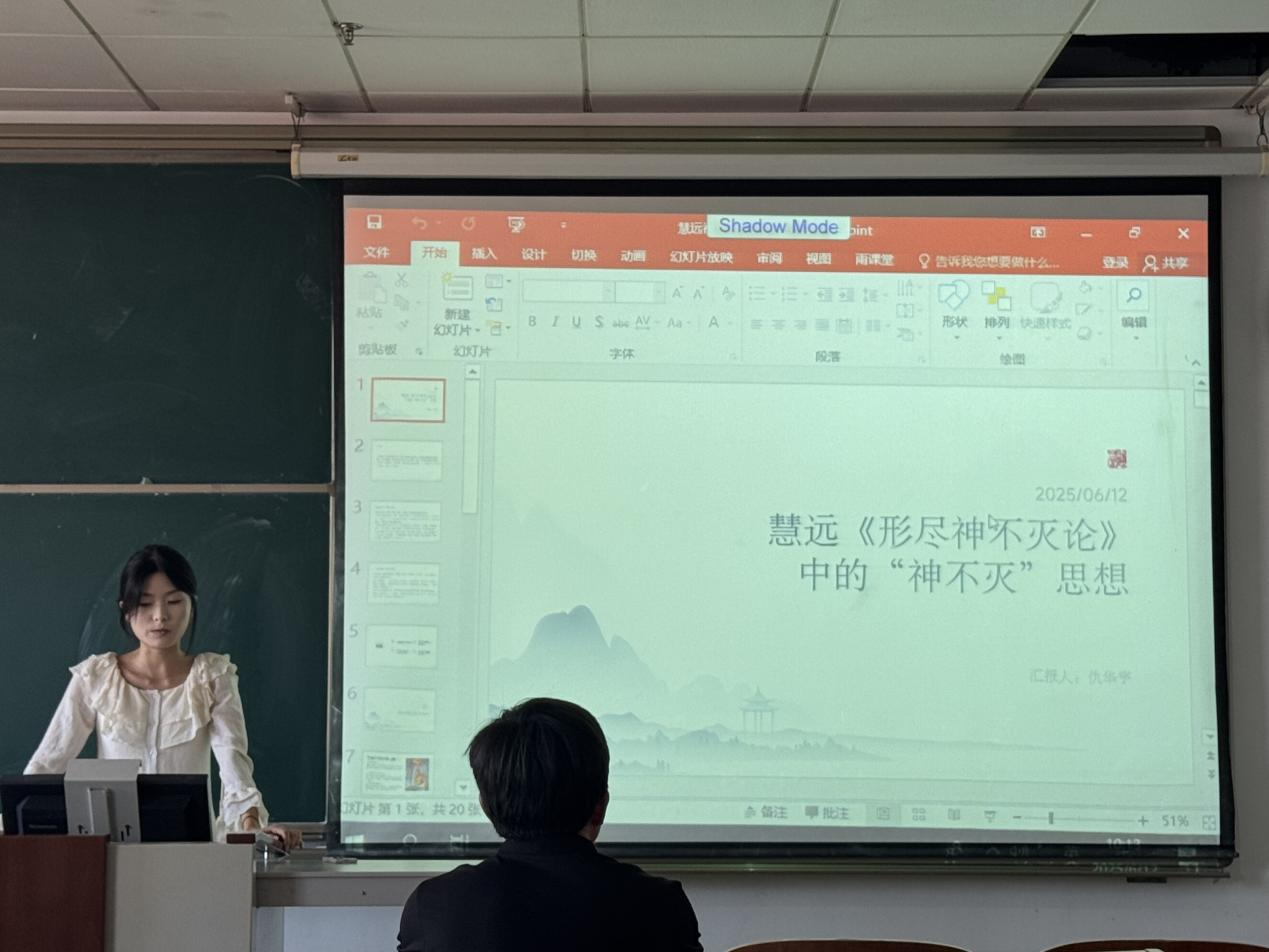 2024级仇华宇同学分享的是《弘明集》,讲解了慧远的“神不灭”思想,慧远以“薪火之喻”阐释形神关系,该思想是通过哲学化的精神实体论证,为佛教轮回体系提供了形而上学支撑。并提出若神是清净不灭的本体,为何会被“无明贪爱”驱动的相关问题。