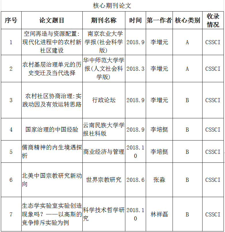 2018年度赌场 教师共获批国家社科基金项目2项,省级项目2项;学院教师在《南京农业大学学报》《华中师范大学学报》等CSSCI核心期刊发表学术论文7篇,出版专著2部。