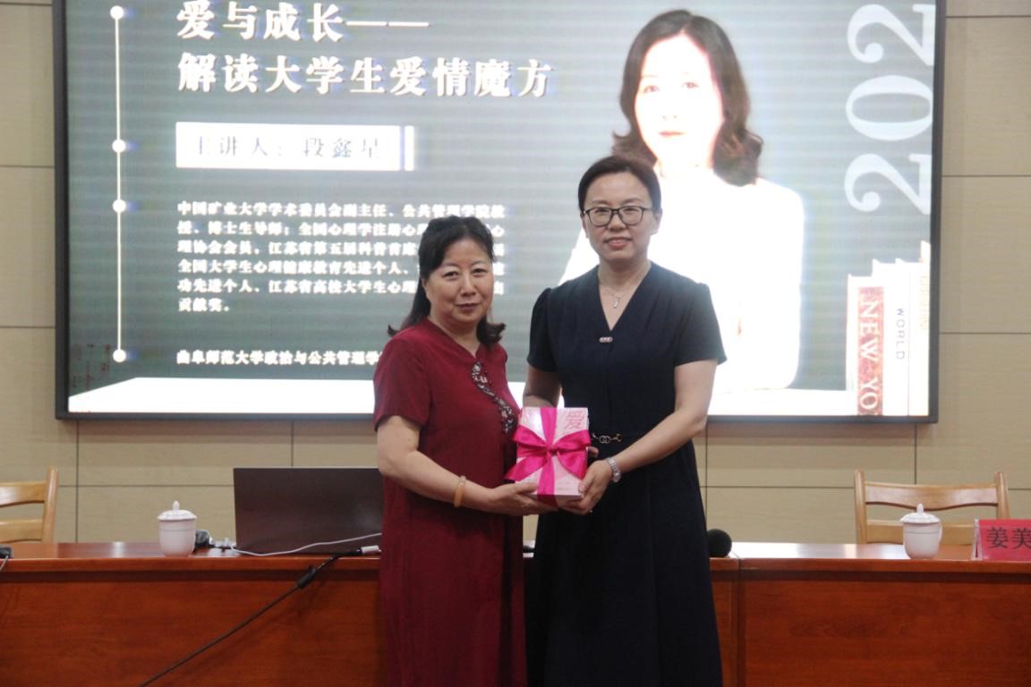 报告伊始,段鑫星教授向我校赠送自己的作品《恋爱心理必修课》,姜美颖处长代表全体师生接受捐赠并向段鑫星教授表达谢意。