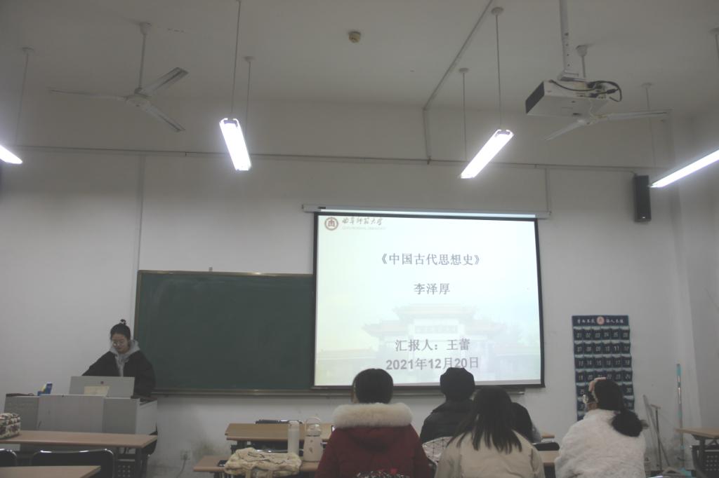 2021级王蕾同学分享了李泽厚的《中国古代思想史》,其中,主要概括性的梳理了从先秦时期的诸子百家思想到明清之际的新儒学等思想,总结了中国伦理学特点是:一方面强调道德的先验普遍性、绝对性,另一方面又强调此先验、普遍、绝对即在经验的感性、心理之中。即所谓的“体用不二”。
