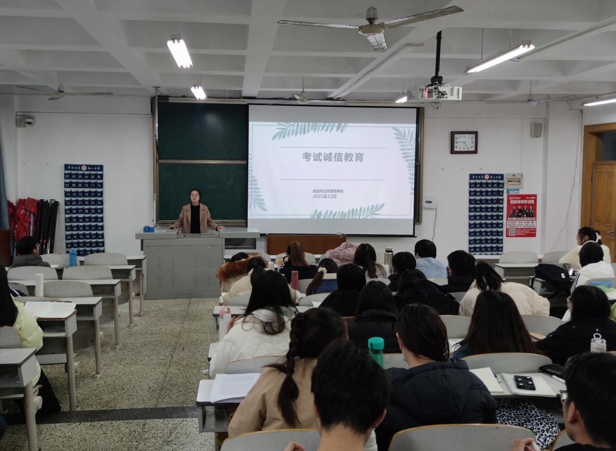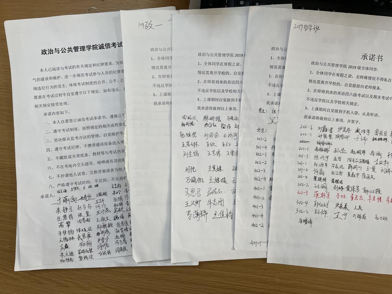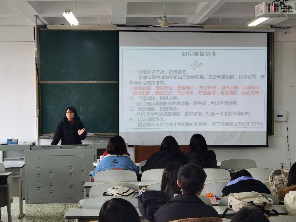 各辅导员老师通过讲述诚信的内涵使同学们认识到诚信对于建设人类文明社会的重要性。以考试中的诚信危机现象为例强调有关考试行为的相关规定,阐明考试作弊的严重性以及考试作弊带来的严重后果。签订诚信考试承诺书,要求同学们严格遵守考试秩序,杜绝侥幸心理,端正态度,认真备考,营造良好考试氛围,以自信的心态迎接即将来临的英语四六级水平测试、考研以及期末考试。