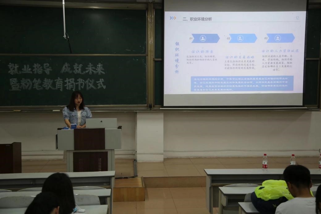 于JA105举办就业指导成就未来暨粉笔教育分类就业指导用书捐赠仪式就业指导活动,本次活动由院团委学生会创业就业与校友服务部主办,院团委书记王元如出席本次活动,各年级同学积极与会。