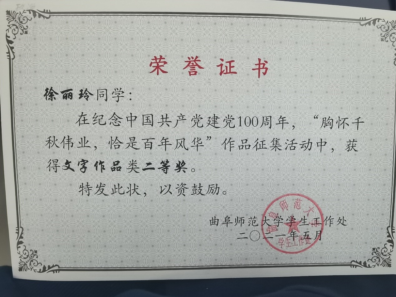 徐丽玲同学荣获文字作品二等奖,王炳琦同学荣获摄影作品三等奖。他们用自己的作品表达了对党的热爱和赞美,从众多参赛者中脱颖而出,这不仅仅是对他们个人能力的肯定,也是政院全体学子爱国爱党的真实写照。