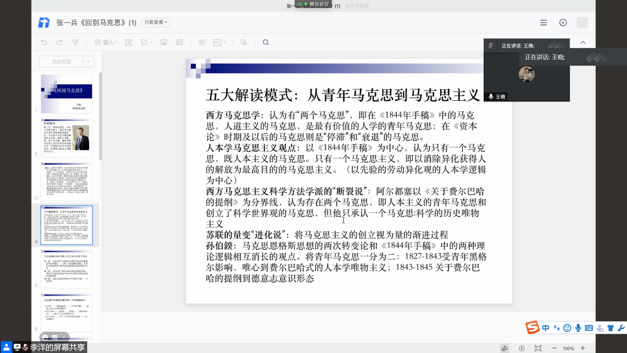 随后,2020级王晓同学就张一兵的《回到马克思》一书进行了分享,分析了1844年马克思在经济学研究时已经存在的真实哲学逻辑进度:在客观向度上,向古典经济学开掘的社会唯物主义,到黑格尔的对现实物化逻辑的唯心主义颠倒和批判;在主体向度上,由西斯蒙第首先开河的经济学理论批判,经过蒲鲁东、赫斯和青年恩格斯,是一条在经济学语境中主体价值冲击的基本逻辑线索。