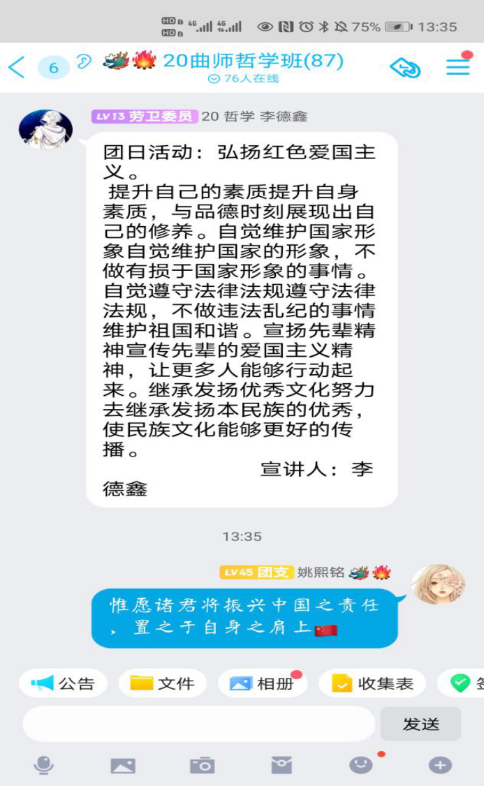 热血青年,爱国心切。团日活动进行过程中,各团支部形式多样、生动精彩的方式引起同学们强烈共鸣,激发赌场 学子炽烈爱国热忱。19级政治学三班借助班级QQ公众号展示及微信推文等宣传窗口进一步弘扬爱国主义崇高精神。通过学习团课会议,同学们还深入了解爱国主义四重意蕴。作为中华民族不懈价值追求,求索灿烂辉煌古代文明,中华民族融合统一、经邦治国成为爱国主义主旋律;回看当代优秀精神文明,中国人民必将进一步弘扬爱国主义优良传统,努力实现国家富强、民族振兴、人民幸福奋斗目标。20级政治学二班以“讲解新时代爱国主义本质”、“观看爱国主义题材电影,团员代表积极发表观后感”、“团员代表结合现实情况提出新时代青年正确做法”及“号召全体团员弘扬爱国主义精神”四个方面进行,高举爱国主义旗帜、坚定爱国主义信念,内化于心、外化于行,真正贯彻落实爱国主义伟大精神。各班活动形式异彩纷呈,爱国热情高度统一,充分彰显政院学子浓郁爱国之心、强烈报国之志。
