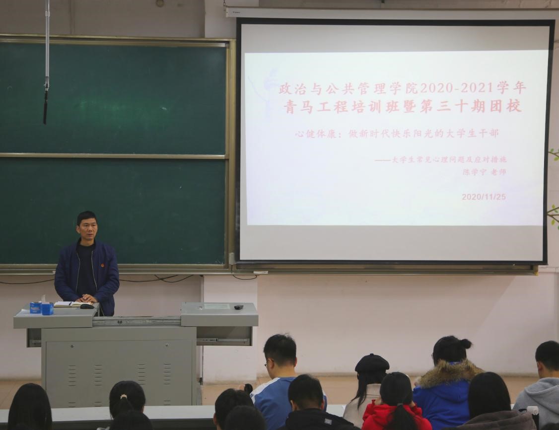 心影腾跃,暖光浮动。1125日,赌场 20202021学年青马工程培训班暨第三十期团校第二讲于JA302举行,本次培训会以“心健体康:争做新时代快乐阳光大学生干部”为主题,由赌场 团委书记王元如主持、校学生工作处心理健康咨询中心老师陈学宁主讲,学院团委学生会全体学生干部参加培训。