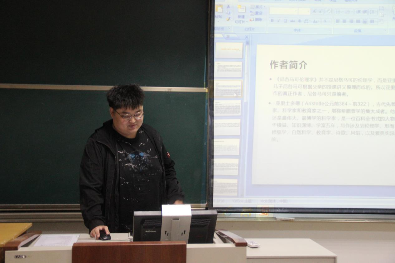 2020级常洪泰同学分享了亚里士多德的《尼格马可伦理学》,通过以幸福观为核心来展开探讨。他讲到亚里士多德在书中以善作为研究幸福的逻辑起点并说明幸福是灵魂的一种合乎现实的德性活动。德性是通往幸福的途径,公正是幸福的前提保障,快乐并不等同于幸福但快乐与幸福是息息相关的。要保持适度的理性,这样才能合乎德性,从而获得幸福。