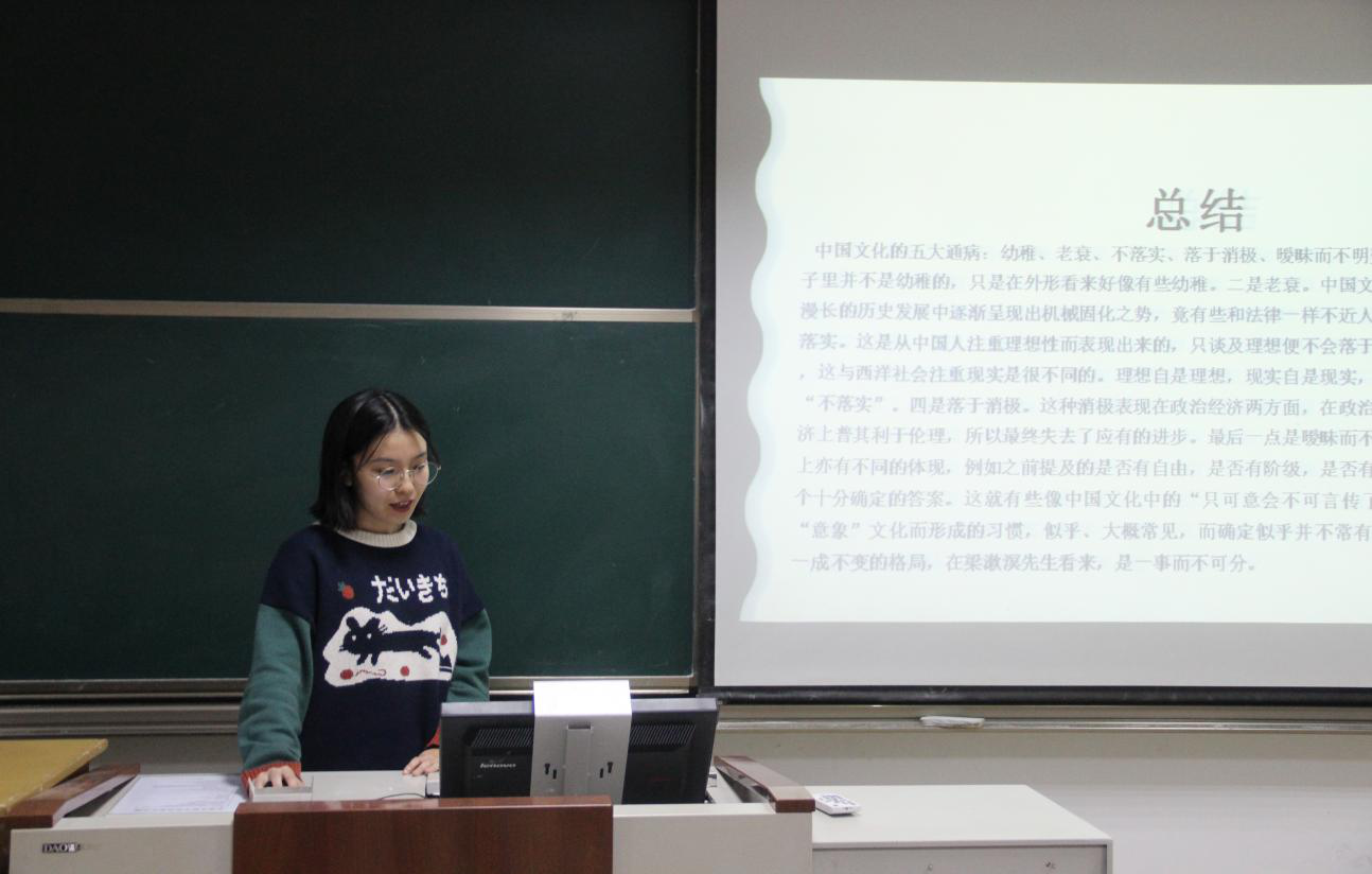 2020级江雨同学分享了梁漱溟的《中国文化要义》一书,本书共有十二个章节,总的来说是围绕着伦理本位与职业分途这两个方面进行说明。梁漱溟先生以中国文化所具有的十四个特征为线索,通过中西方文化差异性的对比,阐述了如宗教与道德、阶级与国家等诸多问题。说明了所有中国文化的许多特征其实都是文化早熟这一原因所在。要认识中国问题,必须要明白中国社会在近几百年的变化及内外形势,这样才能更好地促进中国文化的发展。