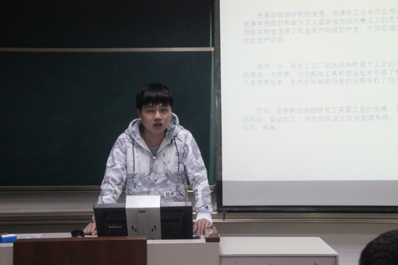 随后,2019级鞠江坤同学分享了恩格斯创作的政治经济著作《英国工人阶级状况》。在《英国工人阶级状况》中,恩格斯用大量的事实揭露资本主义制度尤其产业革命是造成工人道德堕落的根源,满怀义愤地控诉英国资产阶级对工人犯下的种种罪行,号召号人阶级为自己的最终解放而斗争,建立社会主义。