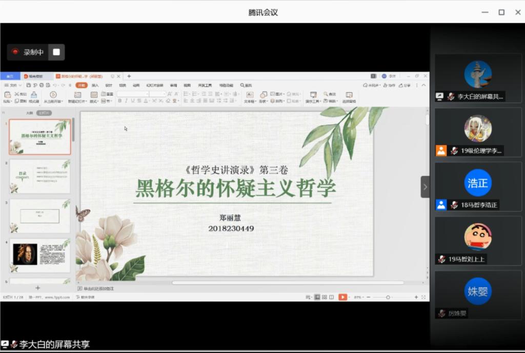 本期政研论坛读书交流会围绕马克思主义哲学相关书目和人物思想展开讨论。首先,18级郑丽慧同学分享了有关“黑格尔的怀疑主义哲学”相关内容,在《哲学史讲演录》中,黑格尔将两处哲学思想分别称为古代怀疑论和近代怀疑论。黑格尔认为一种思想之所以能够被称作怀疑论,是因为这种思想是“有意识的和普遍的否定”。虽然黑格尔将休谟的近代怀疑论和皮罗主义的古代怀疑论都称作一种怀疑论,但认为他们的思想并未达到黑格尔式的“彻底的怀疑主义”的高度,只是一个需要扬弃的阶段,最终黑格尔扬弃了前两者的怀疑论,走向一种彻底的怀疑主义。随后,19级杨冰洁同学分享了《路德维希·费尔巴哈和德国古典哲学的终结》一书的主要内容,本书分析批判了黑格尔哲学,论述了哲学基本问题和费尔巴哈唯物主义自然观,批判了费尔巴哈唯心主义宗教观和道德观,同时阐述了马克思主义哲学的产生及唯物主义的基本原理。19级郑岩同学分享了格奥尔格·卢卡奇的《历史与阶级意识》一书,他以本书开启了西方马克思主义思潮,被誉为西方马克思主义的创始人和奠基人,同时在书中以物化、总体性、阶级意识等范畴表述了对马克思主义的新的理解。