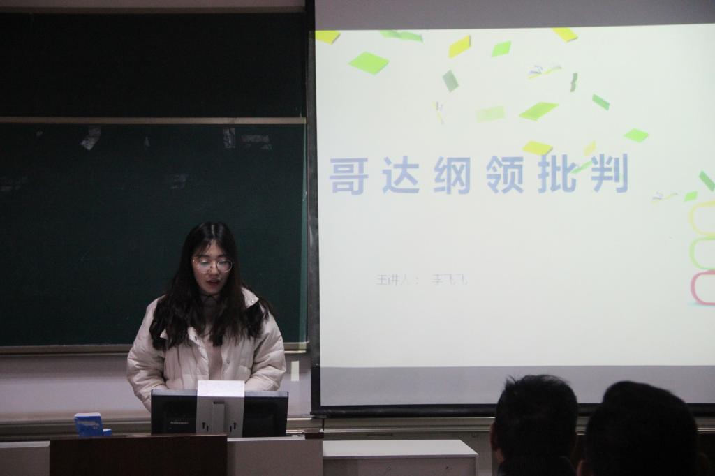 2019级李飞飞同学就《哥达纲领批判》做了相关介绍,她表示劳动是一切财富和文化的源泉,正因为有益的劳动只有在社会中才是可能的,所以劳动所得应当属于社会中的一切成员。这启示我们,社会的发展进程必然是随着实践而不断发展的,需在坚定共产主义理想信念的同时,准确把握我国正处于并将长期处于社会主义初级阶段的基本国情。