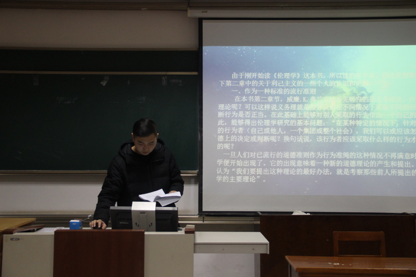 本期政研论坛读书交流会围绕伦理学相关专业书目及人物展开讨论。2018级的赵蕊同学为大家分享了麦金太尔所著的《伦理学简史》,主要从亚里士多德自制思想的背景,与实践三段论、德性、幸福的关系,自制的时代价值等方面进行了讲解。她讲道麦金太尔等人意识到近现代伦理学的种种缺陷,其中原因之一是偏离亚里士多德的德性伦理路线。复兴亚里士多德的德性伦理学是当代道德哲学的一项重要任务。亚里士多德自制思想的提出涉及了一般智慧判断到一个具体实践判断的实践推理过程,对于其他伦理思想具有十分重要的德性实践意义。
