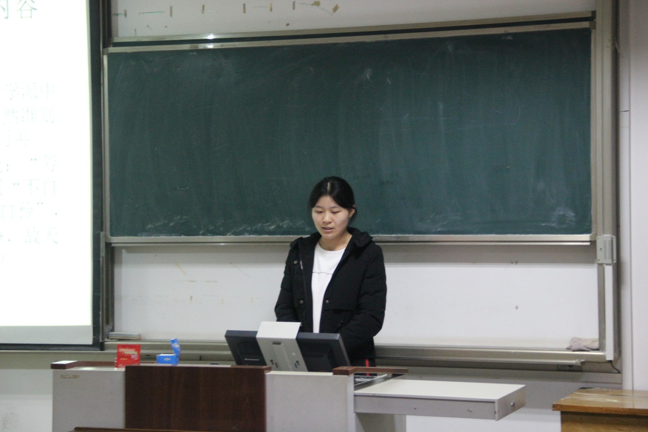 本期政研论坛读书交流会围绕中国哲学相关书目及人物思想展开讨论。首先,18级崔竹青同学通过分享自己所写的一篇论文来介绍老子的“不争”之德。道家创始人老子提倡“无为”的思想,其中一个重要的体现就是“不争”。“不争”意味着要保持一种甘于居下、淡泊名利、少私寡欲的生存状态,它如同水一般具有包容性、涵养性的特征。作为一种美好品德,“不争”是每个人所应当具有的重要美德,它是统治者更好施政所具有的善德,推而广之,它也是天地万物所本具有的一种内在品德。老子的“不争”思想所体现出来的价值观对个人修养的提升、和谐社会的建构与生态文明的建设都具有极其重要的意义。随后,19级宋琪同学就《〈易经〉校释译论》一书进行了分享,她介绍到《易经》包括《周易》和《易传》,《周易》包括卦体、卦名、卦辞、爻辞、用辞五方面的内容,不同的学者对《易经》的性质有不同的见解,通常理解为筮占之书和义理之书,她还对六十四卦中起统帅作用的“乾”、“坤”二卦进行了的讲解,分别从《彖》、《象》、爻辞等方面进行了具体的介绍。