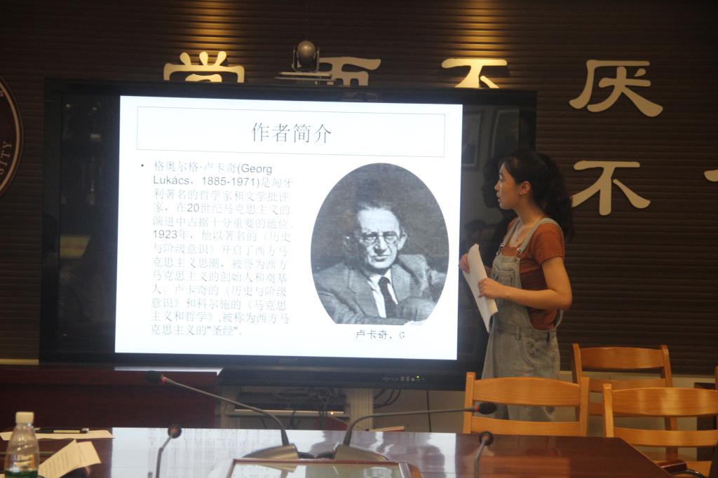 本期政研论坛读书交流会围绕哲学专业相关书目及人物展开讨论。首先由马克思主义哲学专业的李莹同学就《历史与阶级意识》阐述了卢卡奇的物化理论,物化理论是卢卡奇关于西方马克思主义的重要组成部分。在资本主义社会,商品生产巨大堆积,物化现象无处不在且已内化为一种意识,即物化意识。随后,伦理学专业的林祥楠同学则阐述了柏拉图《理想国》中的正义思想 ,从国家的正义和个人的正义入手,进一步分析两者之间的区别与联系,并最终落实现实社会的和谐建构以及公民教育之中。最后,中国哲学专业的赵海蔚同学,从中国传统文化入手,系统阐述了自然国学,阐述了自然国学的四个部分,即:提出与形成、发展和高峰、衰微与复兴以及其七大特点。与会同学积极谈论,学术气氛浓厚,在讨论卢卡奇物化理论的观点时,李莹同学发表总结,卢卡奇是从批判商品拜物教这一资产阶级意识形态的视角开始对物化现象的分析的。“物”化是生活在资本主义社会每一个人所面临的必然的、直接的现实性”。