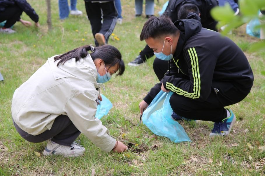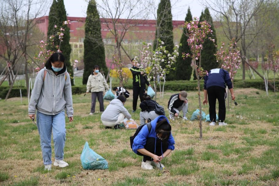 劳动伊始,同学们认真观看赵予老师示范、了解活动注意事项。随后,在马腾老师的指导下,同学们陆续进入状态,将所学的技巧运用到实践中去,利用工具处理杂草,让花草树木生机勃勃。在现场,同学们个人行动或结伴而行,一锄、一铲、一塑料袋,合力劳动,整片草坪不久便焕然一新。在这个过程中,同学们表现出极大兴趣,专心劳动、挥洒汗水,在劳动中感受乐趣,新时代青年的朝气与活力充分显现。