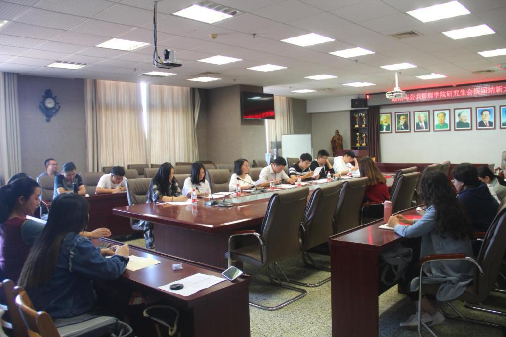 于JC909会议室举行2019级研究生会换届纳新大会。学院党委副书记张忠凯老师、研究生辅导员徐莉老师、2018届研究生会主席团、以及20多名竞岗的优秀研究生参加了此次活动,大会由徐莉老师主持。