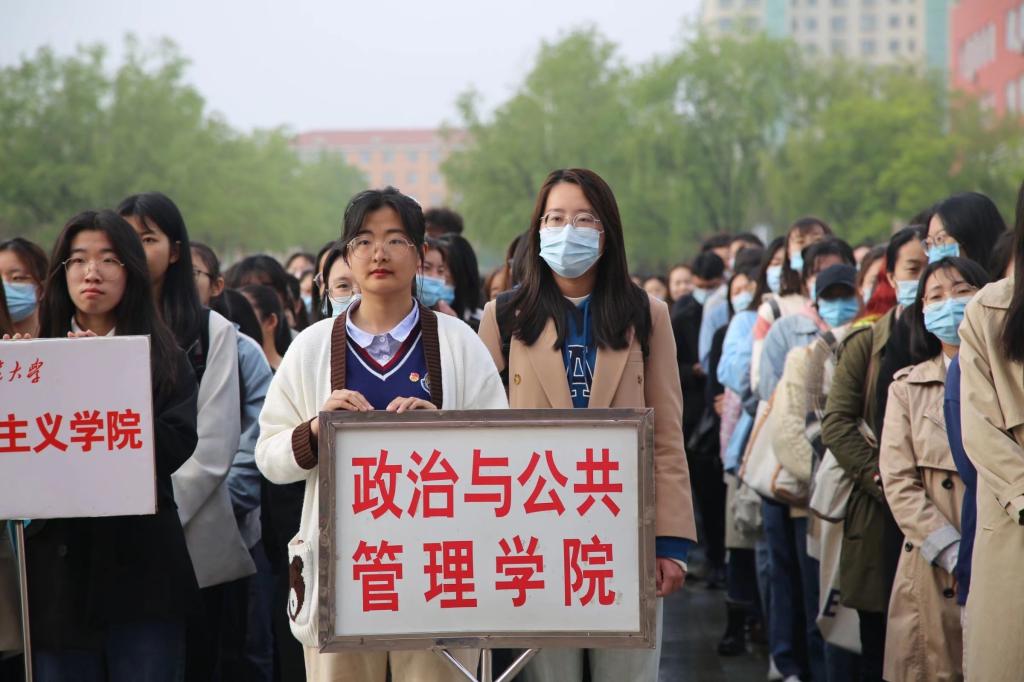 活动伊始,国旗护卫队整装待发,待“齐步走”口令响起,迈着铿锵有力的步伐向升旗台走去,气势锐不可当。伴随着嘹亮的国歌声,鲜艳的五星红旗冉冉升起,在初日的光辉照耀下,全体师生肃然注目。接着,老师们为新团员佩戴团徽,嘱咐同学们今后要更加严格要求自己,严格遵守团章,履行团员义务,将共青团的精神牢记在心。随后,新老团员面向团旗庄严宣誓。最后,快闪形式演唱的歌曲《我爱你中国》,朗诵的《百年风雨砥砺,初心历久弥坚》和合唱的《中国新时代》展现了当代青年为党庆生,讴歌新时代的精神风貌,表达了对中国共产党和祖国的热爱之情。