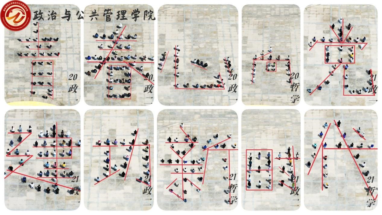 “青春心向党,共建新时代”主题活动,日月广场上由学院各团支部全部团员青年共同努力,分工协作,排成“青春心向党 建功新时代”,共同展现新时代曲师政院学子的青春誓言。