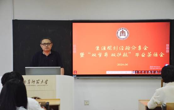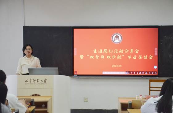 于JC614举办生涯规划经验分享暨“双学导 双护航”毕业茶话会。学院党委书记卢瑞霞,副院长林士俊莅临现场,优秀学生代表魏瑶、吴泽文、王福林、聂宇瑶进行经验分享,“双学导 双护航”小组成员积极参与。