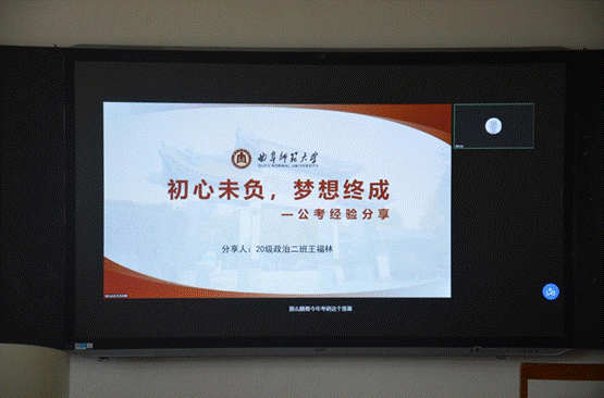 考公一次上岸的王福林师哥因个人原因未能到场,他通过线上视频的方式就公考经验进行了分享。他向大家详细介绍了公务员考试的具体步骤以及注意事项,并结合自身经验为大家制定了详细的公考备考指南。