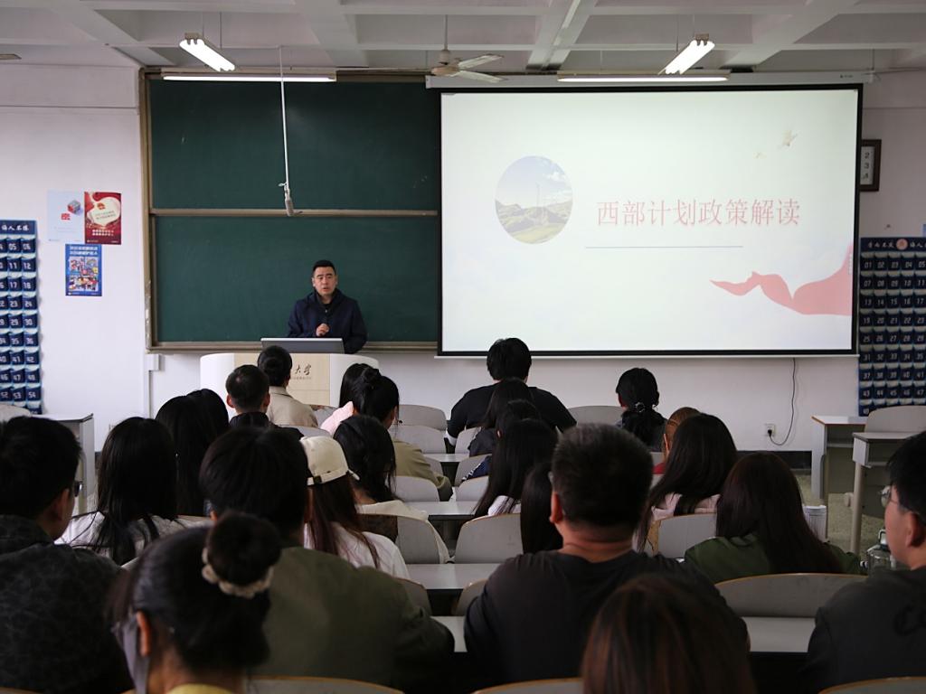 宣讲会上,马腾老师从国家战略层面解读了西部计划的重要意义,详细讲解了项目背景、服务内容及发展前景。接着他着重介绍了报名西部计划条件、选拔流程等具体实施方案,系统解读了服务期满后在考研加分、定向招录、公务员考试等方面的优惠政策。在总结性讲话中,马腾老师号召青年学子积极响应国家号召,到西部基层建功立业,用青春与汗水书写属于自己的奉献篇章。
