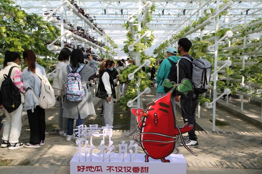 同学们在“尼山鹿鸣”智慧农业综合体调研现代甘薯产业、智慧农业、循环农业与地区产业、生态、人文协同发展发展状况。在朱家林田园综合体调研小米杂粮产业带、高效经济林果带推进创意农业、电商物流、山地运动发展现状。