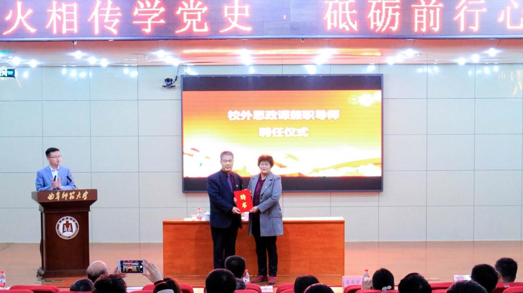 报告会上,扈庆学首先为于爱梅老师颁发了校外思政课兼职导师聘书。随后,于爱梅老师通过讲述祖母与母亲的感人红嫂事迹,诠释了沂蒙人民在艰苦卓绝的斗争中无私奉献、敢于斗争,一心跟着共产党走的朴素情怀,讲述“最后一粒粮做军粮,最后一尺布做军装,最后一个儿子送战场”浓浓的军民鱼水情;结合新时代沂蒙人民开拓奋进、艰苦创业、无私奉献的精神,勉励青年学子传承红色基因、践行时代精神。
