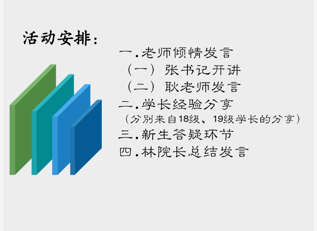 会议围绕“墨海书香‘政’当时”这一主题,分教师寄语、学长经验、新生答疑和院长总结四个不同模块进行。