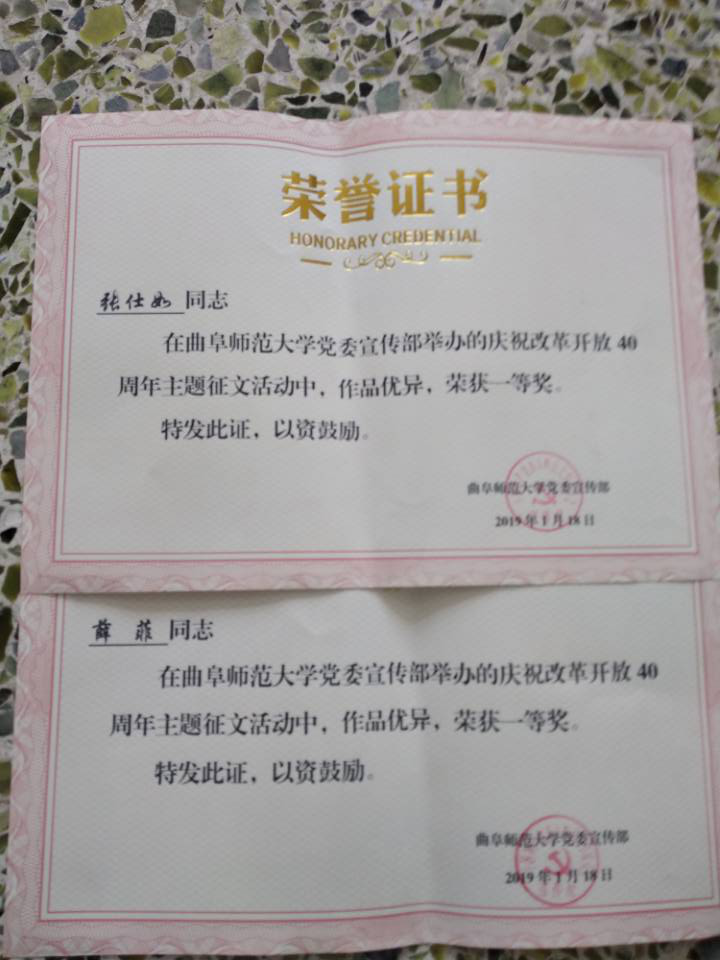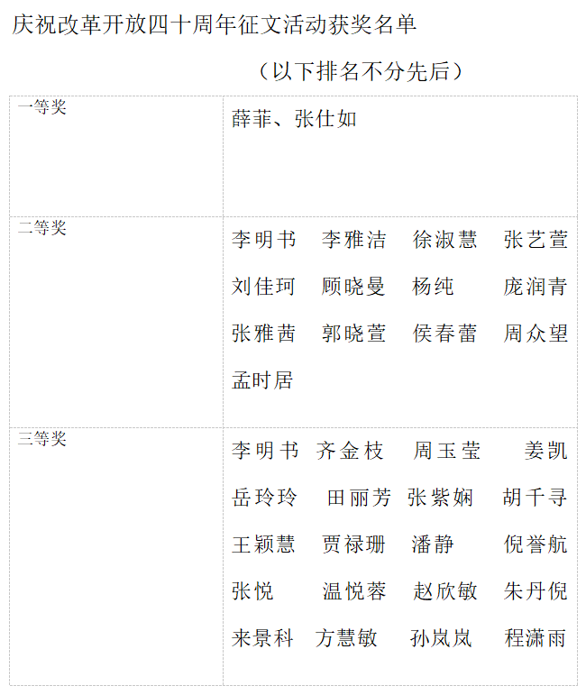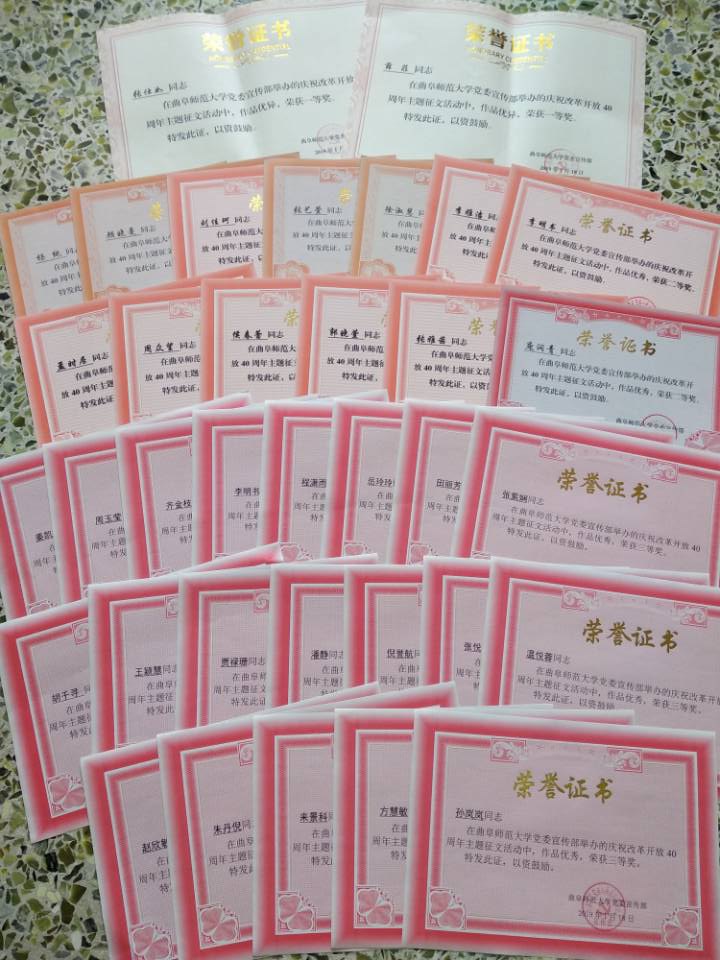 在学校党委宣传部组织的庆祝改革开放40周年主题征文比赛中,赌场 积极组织,学生踊跃参加,共220篇征文提交学校。经过学校评审,薛菲、张仕如2人荣获一等奖,李明书、李雅洁等13名同学荣获二等奖,齐金枝、周玉莹等20名同学获得三等奖,他们在本次征文活动中真情流入、有感而发,其他参赛同学同样笔下生花。所有参赛者都将自己心中的曲园复兴与对改革开放的展望描绘尽致。