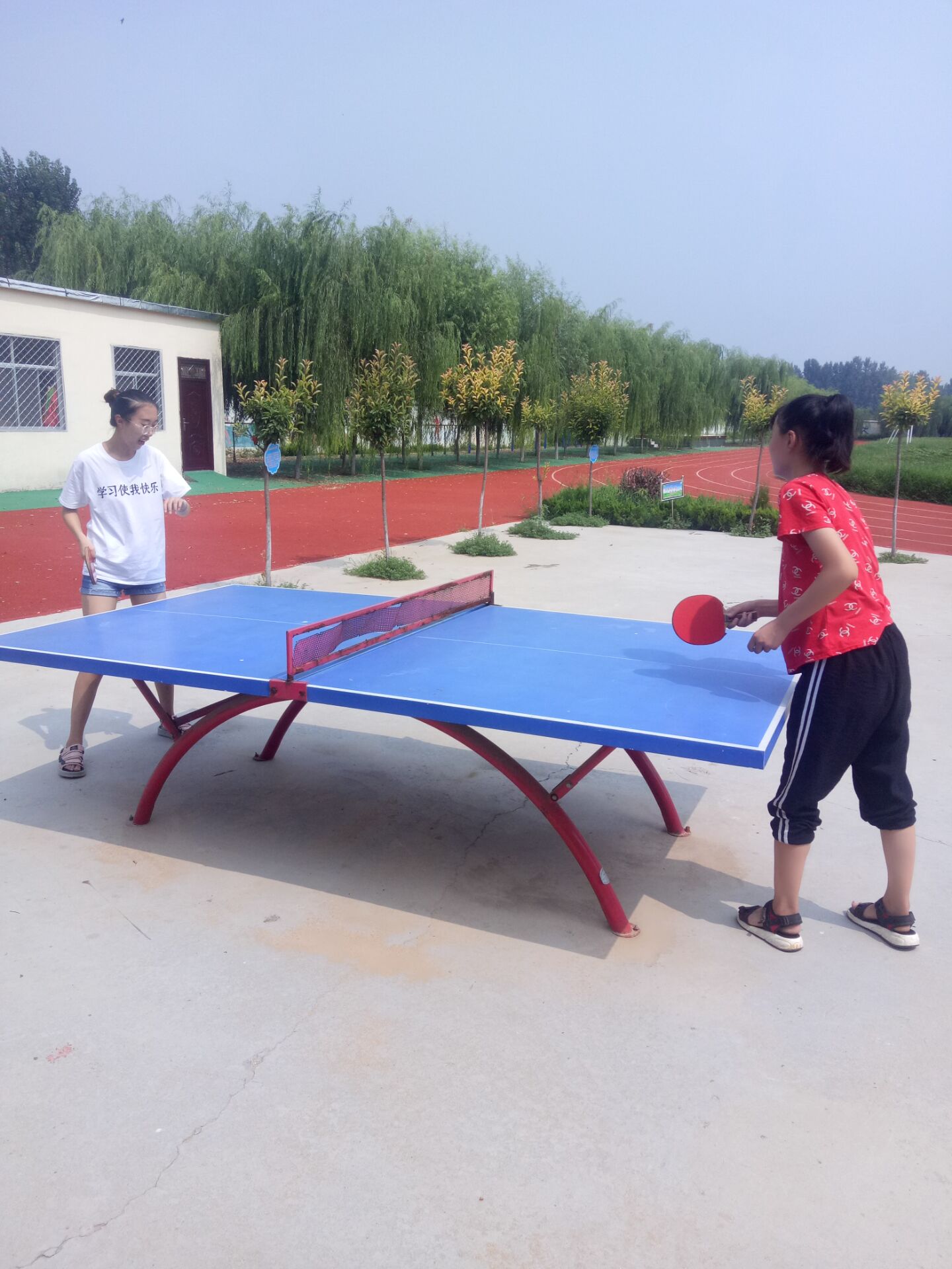 除了在课堂上的进行知识的传输,志愿者们与学生也在体育项目上进行互动。“乒乒乓乓,天下无双”,乒乓球是中国的国球。课余期间,同学要求与志愿者老师进行一场乒乓球比赛,看一看是谁技高一筹。虽然天气炎热,但丝毫抵挡不知学生们想与志愿者老师玩耍的热情。志愿者们了解到,孩子们对乒乓球感兴趣,但学校缺少专业的乒乓球老师,打法都是自学而成。志愿者便耐心教予学生打好乒乓球的技巧,同时给孩子们推荐了几个专业的乒乓球学习的APP。