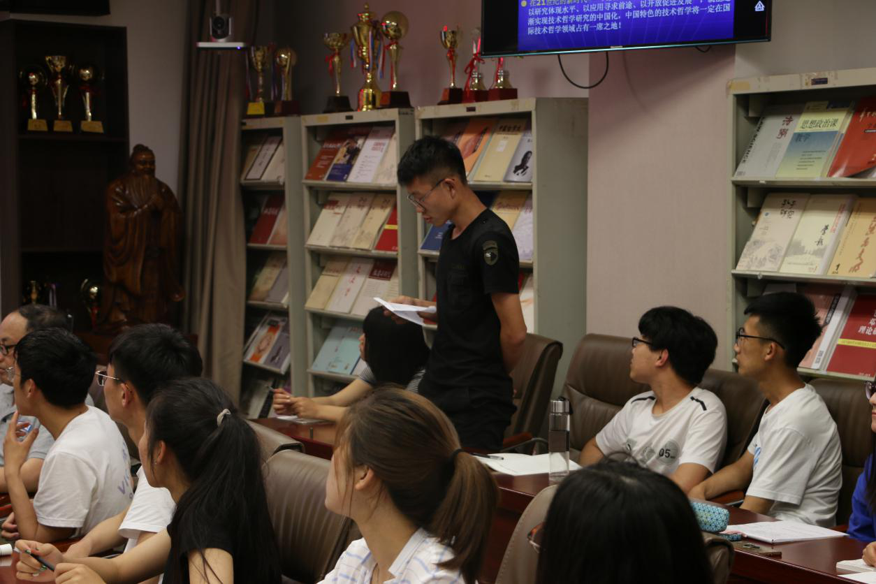 大会伊始,陈凡教授针对国际哲学与技术学会(SPT)做了详细介绍,随后他分别从三个大方向阐述技术哲学的发展和建设。首先,陈凡教授依次从现代技术哲学生成的社会历史条件、标志、徘徊三个方面论述现代西方技术哲学的产生;第二,针对德国、美国技术哲学的发展期、活跃期、成熟期的特点来点明现代西方技术哲学的规范;第三,分别从技术哲学的“转向”、“特点”、“问题”、“趋势”四个方面解释世纪之交的国外技术哲学。最后,陈凡教授谈到对于习近平总书记在哲学社会科学工作会上关于建构中国特色技术哲学的指导思想的看法,并突出从立足本土化、面向国际化、促进中国化三个方面强调中国特色技术哲学的路径选择。在现场互动环节,陈凡教授回答了现场同学有关劳动异化、人工与技术等方面的问题。
