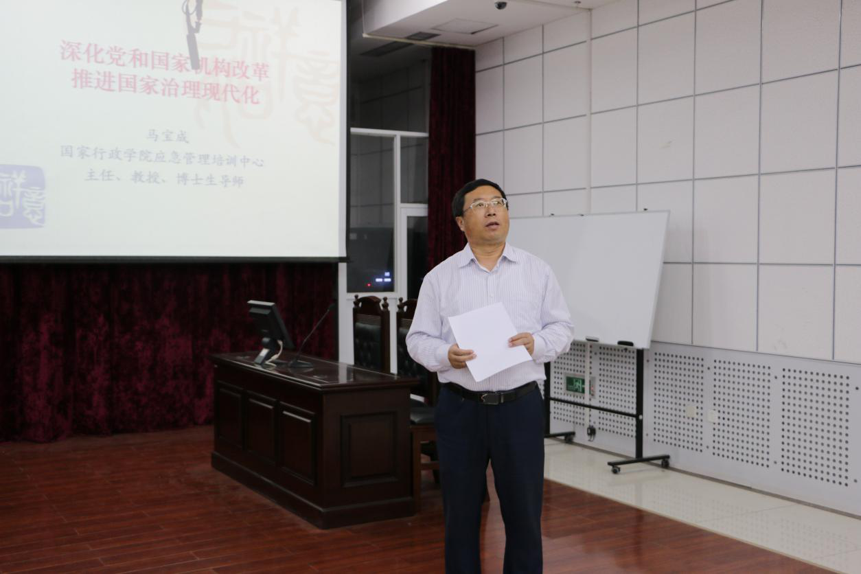 马宝成教授从四个方面讲述深化党和国家机构改革的主要内容。首先,深化党和国家机构改革的目标任务,在新时代、新任务、新征程、新要求下,党和国家机构设置和职能设置同统筹推进“五位一体”总体布局、协调推进“四个全面”战略布局的要求不完全适应,同实现国家治理体系和治理能力现代化的要求还不完全适应,并指出现阶段形势下的十大弊端;第二,通过八个方面、两个重点详细分析深化党和国家机构改革的重点;第三,从全方位、大力度、合职能、促发展四个方面介绍深化党和国家机构改革的特点;最后,从六个方面来阐述党和国家机构改革的下一步,做到“一分部署,九分落实”,《决定》、《方案》的出台仅仅是“万里长征走完第一步”。