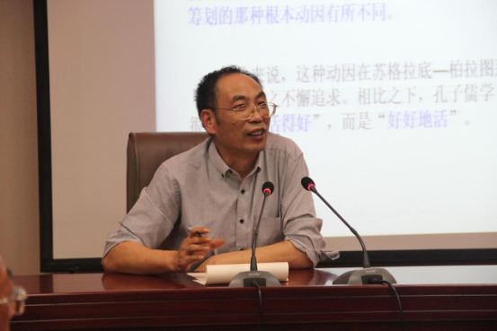 陈治国教授从是否赞同苏格拉底的契约论出发,围绕《申辩篇》、《克里同篇》等早期柏拉图对话作品,首先审查苏格拉底对于社会契约论的真实评估,同时辨明围绕此问题所引发的诸多关键性纷扰。接着详细阐述了柏拉图对社会正义契约论进路的拒斥,主要讲述了柏拉图在《国家篇》中从灵魂论、形而上学和知识论角度对格劳孔版本的契约论方案之严厉批判和挑战。进而讲到孔子儒学与契约论方案的关系,重点分析了契约论道路在孔子儒学中的大致遭遇及其深层因由。最后,陈教授进一步分析孔子儒学和苏格拉底—柏拉图哲学对于社会正义的契约论进路之基本姿态背后的一些深层动力,引出“好好的活,活得好”这一主题。报告历时近2个小时,旁征博引,掷地有声,赢得了在场师生们的阵阵掌声,同学们纷纷表示获益匪浅。