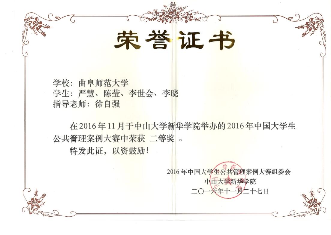 2014级行政管理专业本科生严慧、陈莹、李世会、李晓四位同学组成的团队在公共管理系主任徐自强老师的指导下,提交了《网约车的披荆斩棘之路——基于政策过程的分析》的案例作品,并最终获得大赛二等奖。