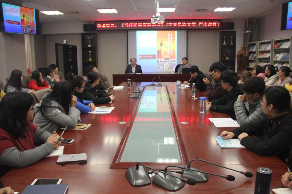 院长王维先,院长助理林士俊,行政管理系主任徐自强出席,2014级、2016级哲学系学生到场聆听报告。