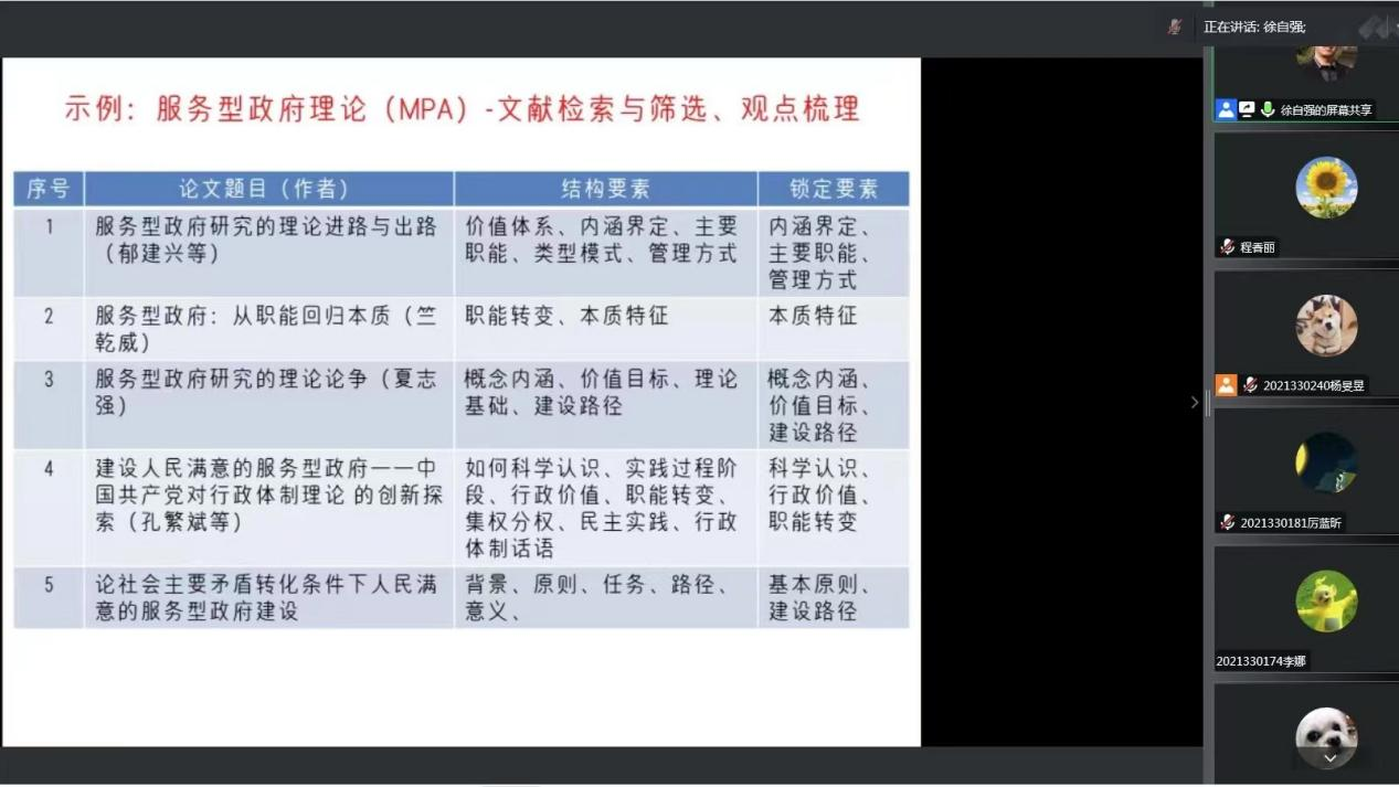徐自强副教授、李培挺教授、秦绪娜教授、李增元教授、林士俊副教授依次担任讲座主讲人,2021级全体MPA硕士研究生参加。