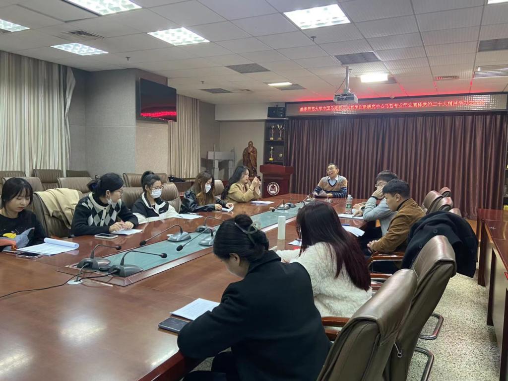 中国马克思主义哲学创新研究中心在JC909采取线上线下结合模式邀请马哲专业部分师生学习阐释党的二十大精神学习交流会。中国马克思主义哲学创新研究中心李培挺、李永刚、刘祥乐、赵松四位老师出席本次交流会,2022级马克思主义哲学专业全体研究生参加本次交流会。