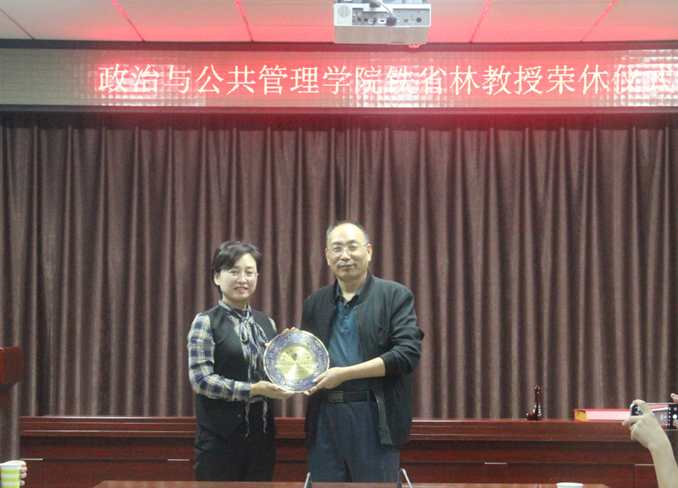 学院党委书记卢瑞霞为铁省林教授颁发荣休纪念品