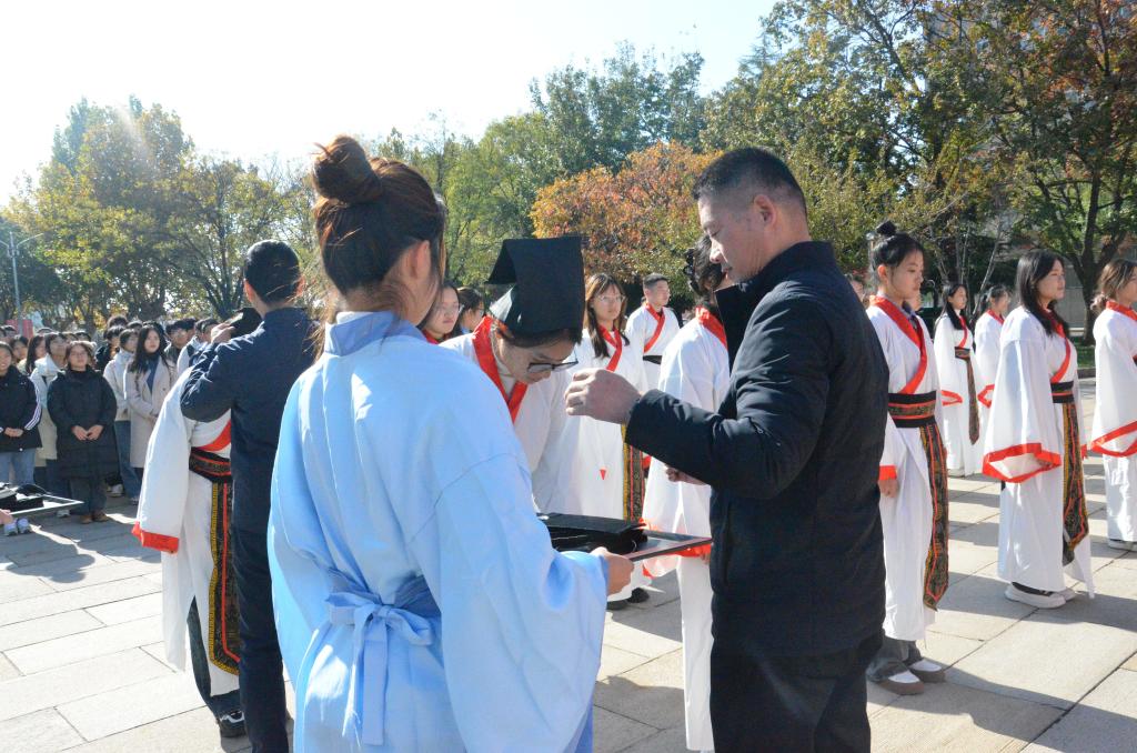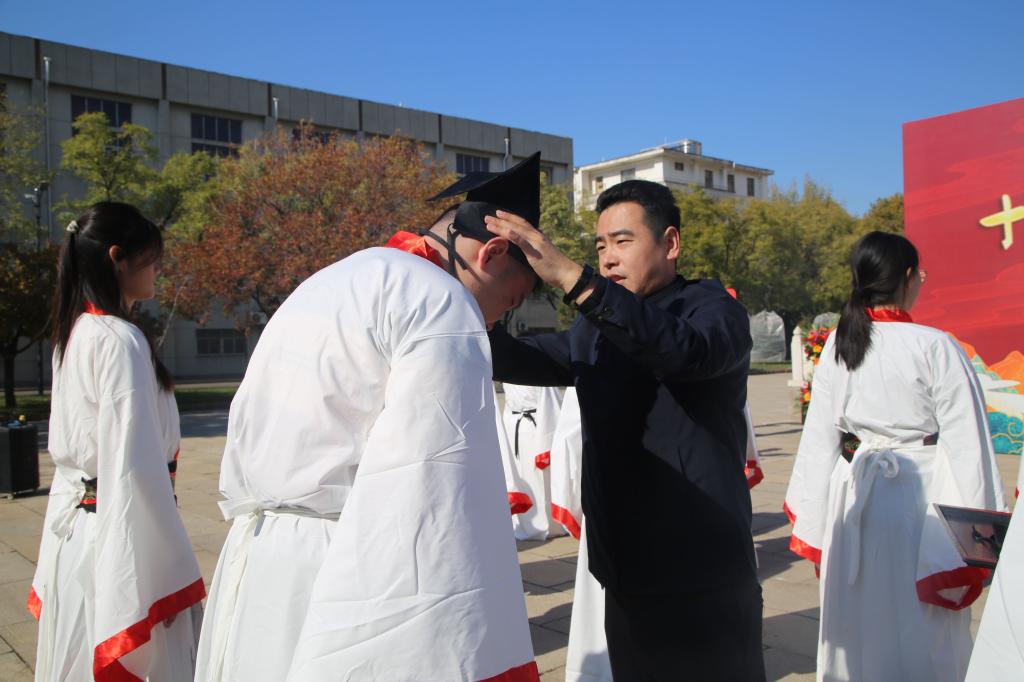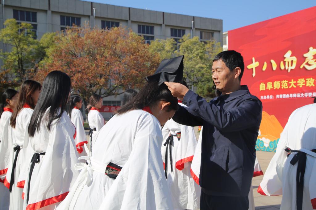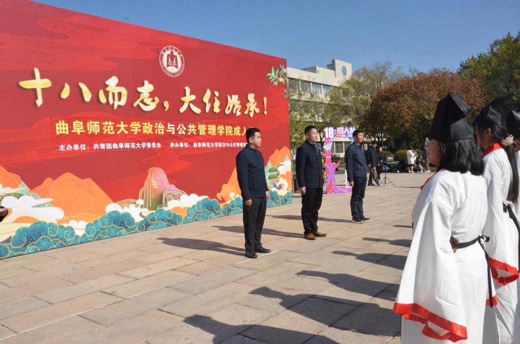 十八而至,大任始承、道义不辞,百名政院学子肃立孔子像前,面谒先师,以一加,一醴,三拜行成人之礼。张忠凯、马腾、王元如面谒至圣先师,行三鞠躬礼,并按照传统为赌场