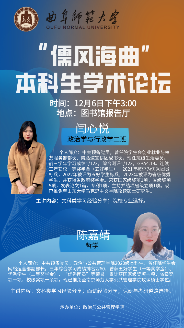 在本次论坛中,闫心悦与陈嘉靖就考研、保研院校专业选择及专业课学习方面展开讲解。其中,闫心悦重点分享自己的学习方法,她总结出本科阶段学习的三个误区即只学习缺少实践活动、紧盯某一竞赛、大一盲目立誓考研或保研,并就误区逐一给出相关建议。并提倡同学们要树立明确的目标与坚持不懈的努力,正是这两项促使她成功推免至山东大学马克思主义中国化研究专业。陈嘉靖就竞赛活动与面试经验两方面展开交流,陈嘉靖鼓励大家多多参与各种竞赛,以此锻炼提高自己的能力,她就面试前材料和心态的准备、面试中应对技巧、面试后复盘三个方面与大家重点分享,这也是她成功推免至南京师范大学中国哲学专业经验总结。