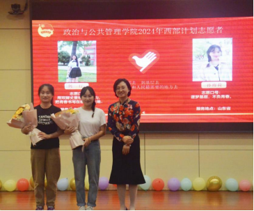 学院党委书记卢瑞霞为西部计划志愿者献上鲜花。